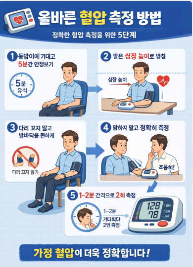 혈압 측정은 단순 숫자 확인이 아니라 정확한 과정이 필요합니다. WHO, AHA, ESC 권고 기준을 따르면 가정혈압과 24시간 활동혈압이 가장 신뢰할 수 있으며, 백의고혈압과 가면고혈압 위험성을 인지하고 정기 모니터링을 통해 맞춤형 치료가 가능합니다.